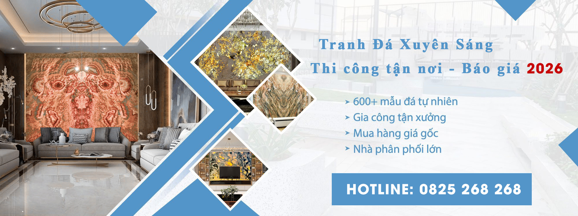 Tranh Đá - chuyên cung cấp và thi công các mẫu tranh đá xuyên sáng tự nhiên cao cấp như Đá Marble, Tranh đá thạch anh, Tranh đá Alpinus, Đá Onyx, Đá Thạch Anh Brazil và Đá Limestone - Moca. Mỗi dòng đá mang vẻ đẹp riêng với đường vân sắc nét, màu sắc tự nhiên và độ bền vượt trội, giúp không gian trở nên sang trọng và đẳng cấp. Tranh Đá cam kết sản phẩm chuẩn chất lượng, thi công tinh xảo và tư vấn phù hợp cho từng phong cách nội thất, đáp ứng mọi yêu cầu thẩm mỹ của khách hàng. Mọi chi tiết xin vui lòng liên hệ qua hotline: 0825.268.268 để được hỗ trợ tư vấn